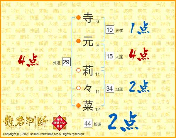 寺(6画)元(4画) 莉(11画)々(11画)菜(12画)