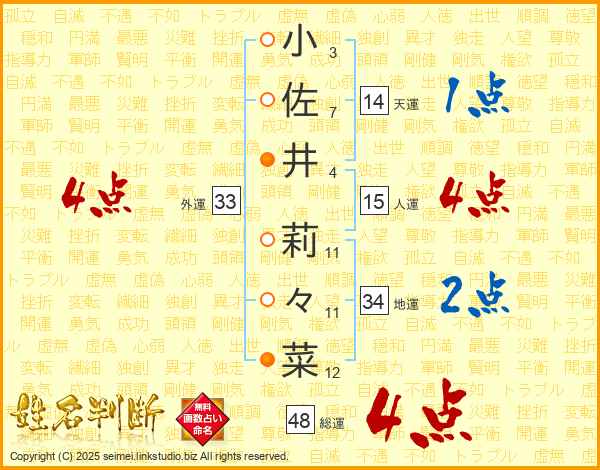 小(3画)佐(7画)井(4画) 莉(11画)々(11画)菜(12画)