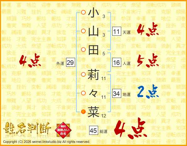 小山田莉々菜さんの総運は45画の4点!