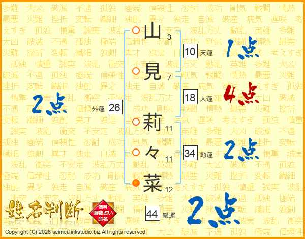 山(3画)見(7画) 莉(11画)々(11画)菜(12画)