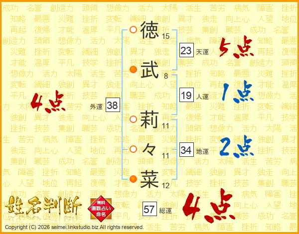 徳(15画)武(8画) 莉(11画)々(11画)菜(12画)