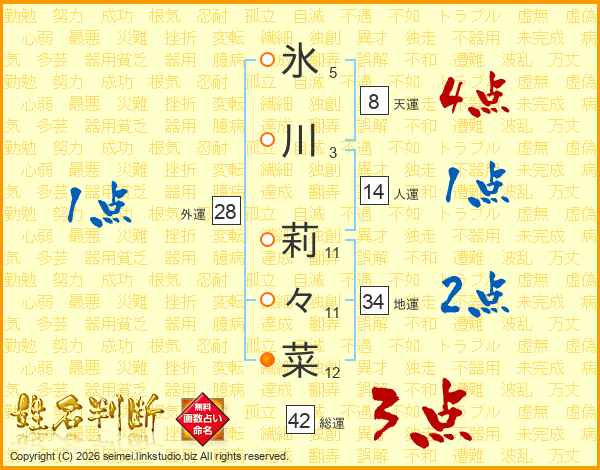 氷(5画)川(3画) 莉(11画)々(11画)菜(12画)