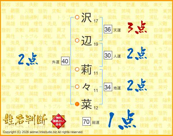沢(17画)辺(19画) 莉(11画)々(11画)菜(12画)