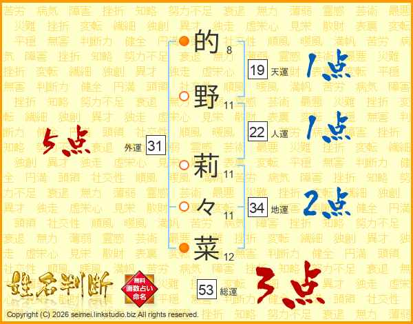 的野莉々菜さんの天運は19画の1点!