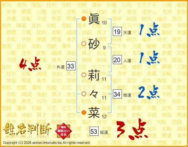 眞(10画)砂(9画) 莉(11画)々(11画)菜(12画)
