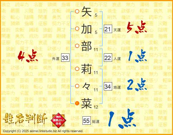 矢(5画)加(5画)部(11画) 莉(11画)々(11画)菜(12画)