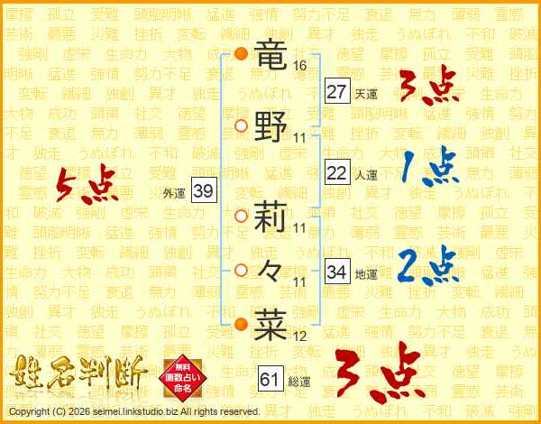 竜(16画)野(11画) 莉(11画)々(11画)菜(12画)