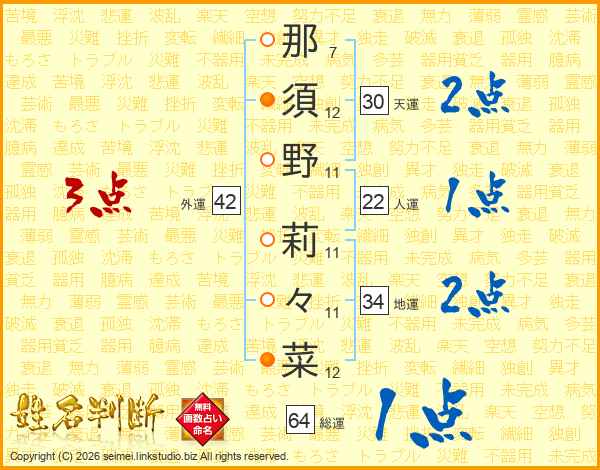 那(7画)須(12画)野(11画) 莉(11画)々(11画)菜(12画)