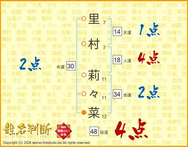 里村莉々菜さんの総運は48画の4点!
