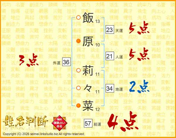 飯(13画)原(10画) 莉(11画)々(11画)菜(12画)