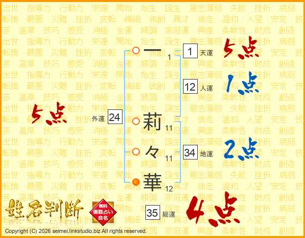 生活面を象徴する運勢です。外部から受ける影響力を表し、結婚運、家庭運や職場、環境への順応性を表します。総運から人運を引いた画数。姓や名が1文字の場合を除く。