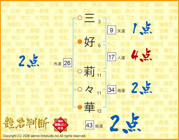 三(3画)好(6画) 莉(11画)々(11画)華(12画)