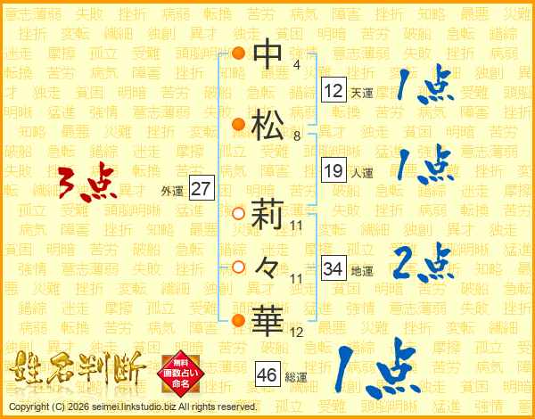 中(4画)松(8画) 莉(11画)々(11画)華(12画)