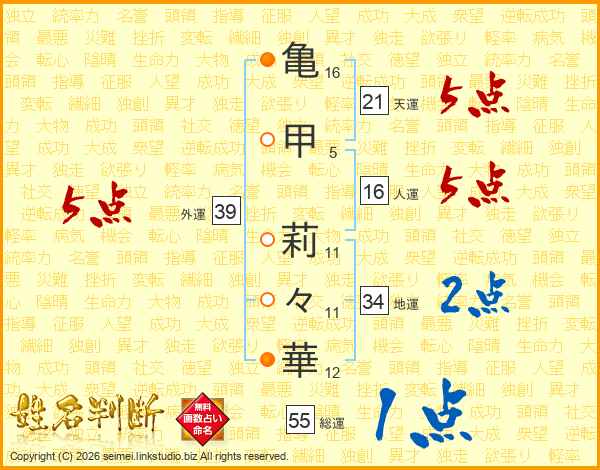 亀(16画)甲(5画) 莉(11画)々(11画)華(12画)