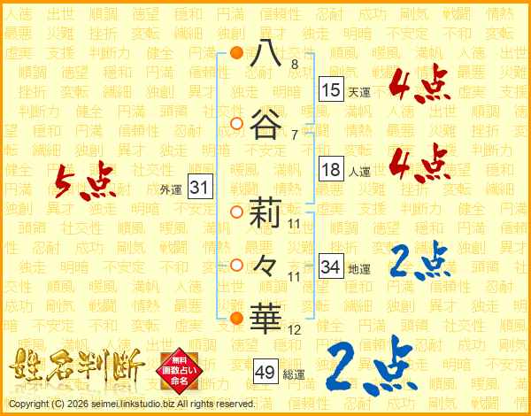 八(8画)谷(7画) 莉(11画)々(11画)華(12画)