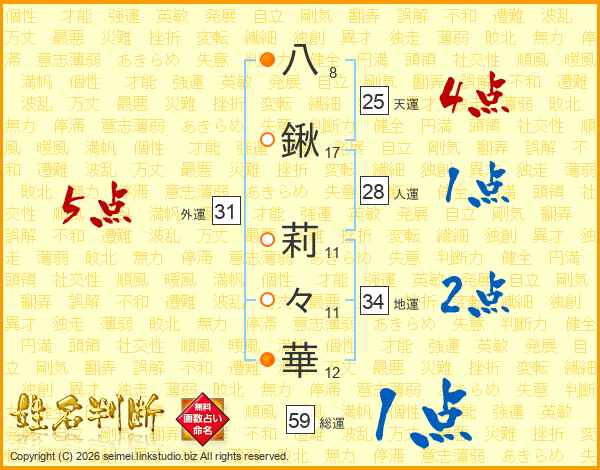 八(8画)鍬(17画) 莉(11画)々(11画)華(12画)