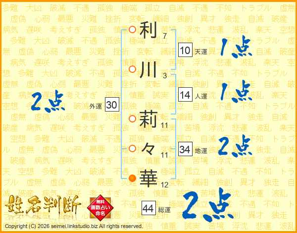 利(7画)川(3画) 莉(11画)々(11画)華(12画)