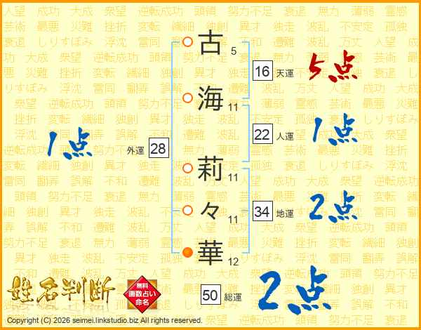 古(5画)海(11画) 莉(11画)々(11画)華(12画)