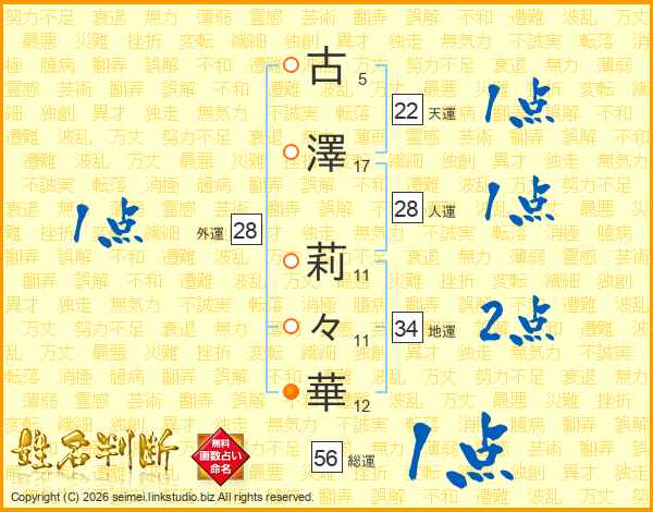古(5画)澤(17画) 莉(11画)々(11画)華(12画)