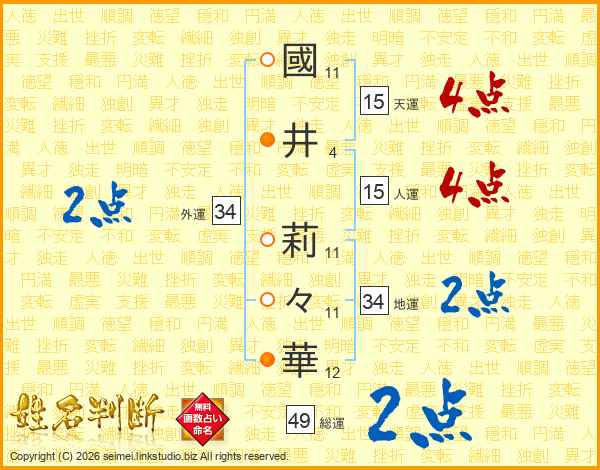 國(11画)井(4画) 莉(11画)々(11画)華(12画)