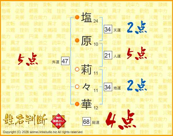 塩原莉々華さんの総運は68画の4点!
