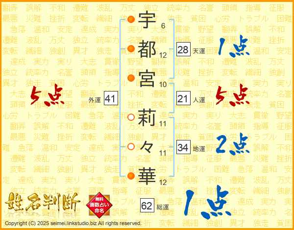宇(6画)都(12画)宮(10画) 莉(11画)々(11画)華(12画)