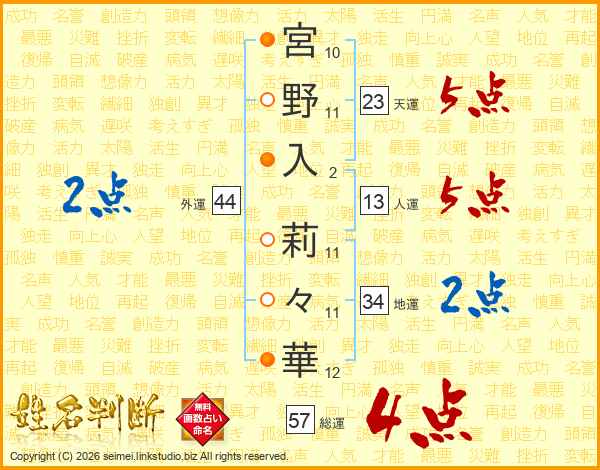 宮(10画)野(11画)入(2画) 莉(11画)々(11画)華(12画)