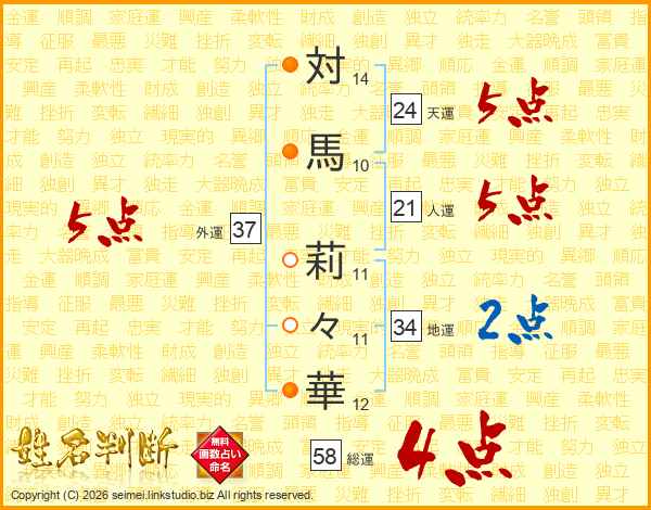対(14画)馬(10画) 莉(11画)々(11画)華(12画)