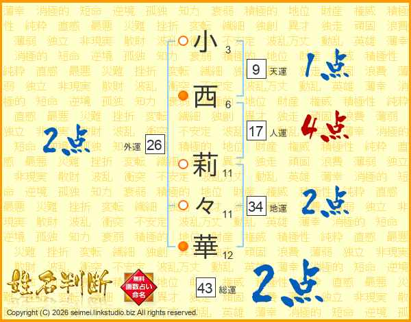 小(3画)西(6画) 莉(11画)々(11画)華(12画)