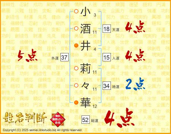 小(3画)酒(11画)井(4画) 莉(11画)々(11画)華(12画)