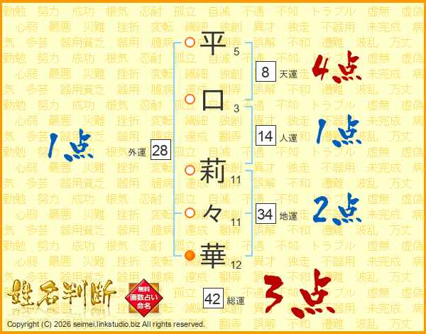 平(5画)口(3画) 莉(11画)々(11画)華(12画)