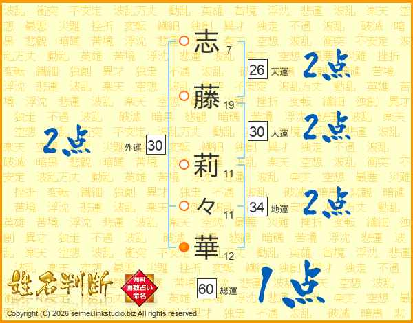 志(7画)藤(19画) 莉(11画)々(11画)華(12画)