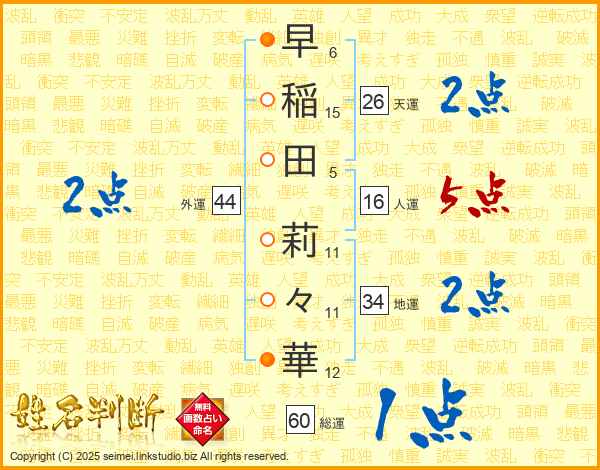 早(6画)稲(15画)田(5画) 莉(11画)々(11画)華(12画)