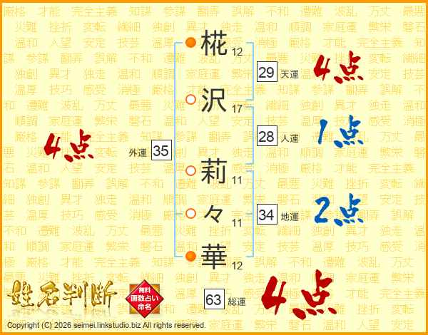 椛沢莉々華さんの総運は63画の4点!