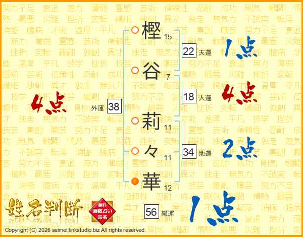樫(15画)谷(7画) 莉(11画)々(11画)華(12画)