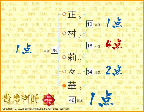 正(5画)村(7画) 莉(11画)々(11画)華(12画)