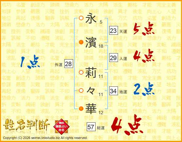 永(5画)濱(18画) 莉(11画)々(11画)華(12画)