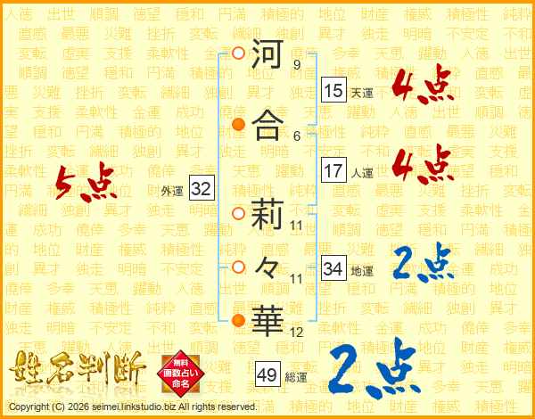 河(9画)合(6画) 莉(11画)々(11画)華(12画)