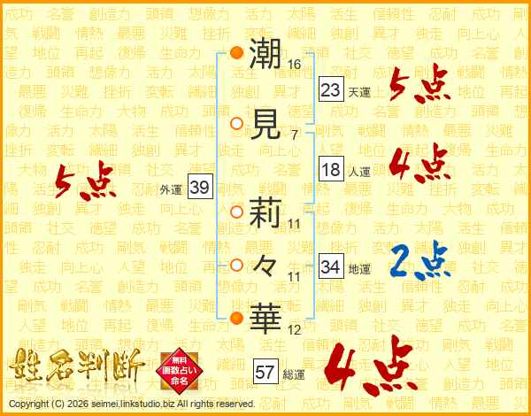 潮(16画)見(7画) 莉(11画)々(11画)華(12画)