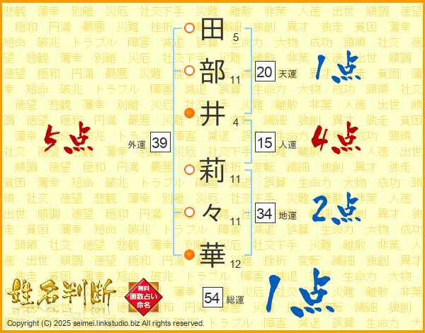 田(5画)部(11画)井(4画) 莉(11画)々(11画)華(12画)