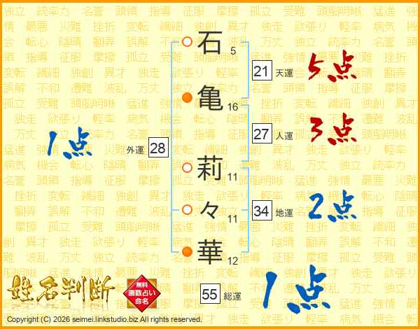 石(5画)亀(16画) 莉(11画)々(11画)華(12画)