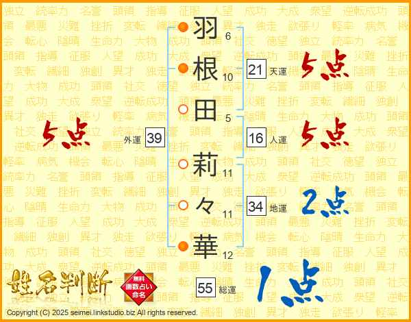 羽(6画)根(10画)田(5画) 莉(11画)々(11画)華(12画)