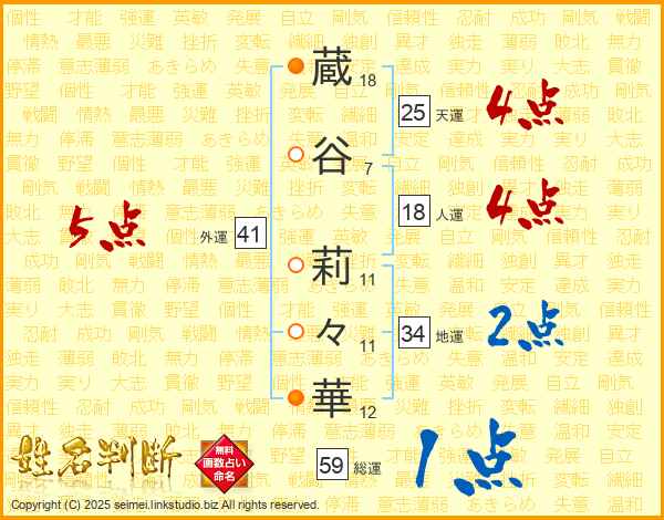蔵(18画)谷(7画) 莉(11画)々(11画)華(12画)