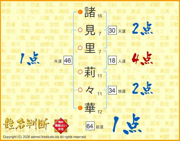 諸(16画)見(7画)里(7画) 莉(11画)々(11画)華(12画)