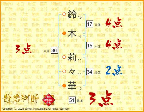 鈴(13画)木(4画) 莉(11画)々(11画)華(12画)