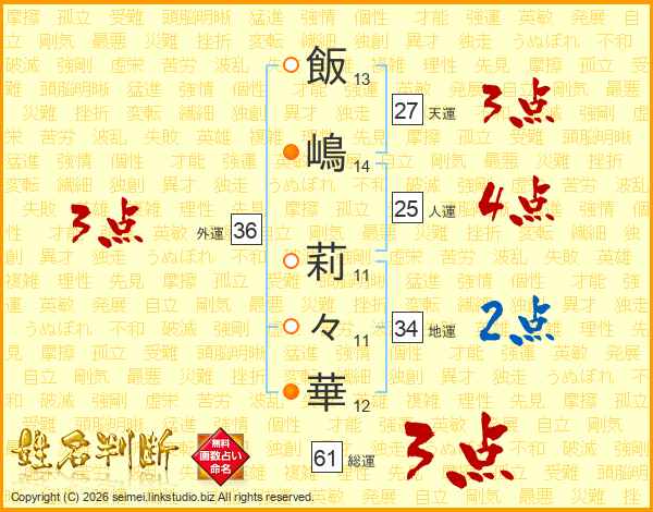 飯(13画)嶋(14画) 莉(11画)々(11画)華(12画)