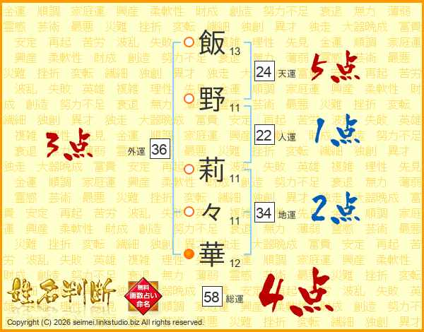飯野莉々華さんの総運は58画の4点!
