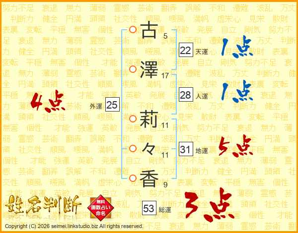 古(5画)澤(17画) 莉(11画)々(11画)香(9画)