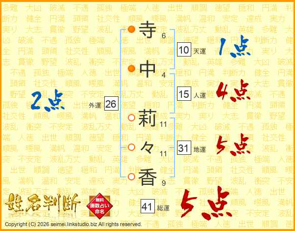 寺(6画)中(4画) 莉(11画)々(11画)香(9画)