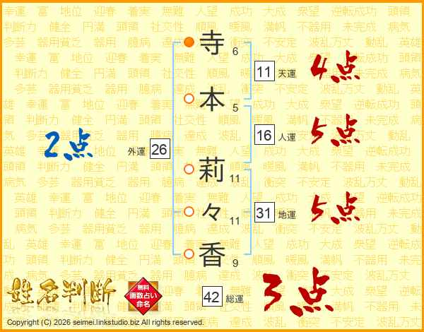 寺(6画)本(5画) 莉(11画)々(11画)香(9画)